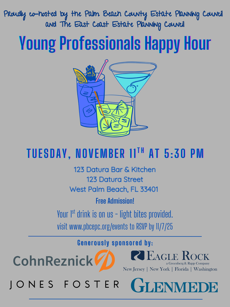 Please join the Young Professionals of the Palm Beach County Estate Planning Council and The East Coast Estate Planning Council for a networking happy hour! All members and non-members under 40, or in their first 5 years of practice, are invited to attend. We encourage members to extend the invitation to colleagues and friends who meet the "young professional" criteria. Free admission. Your 1st drink is on us. Light bites provided. Please register by Friday, November 7th to reserve your spot. See you there!